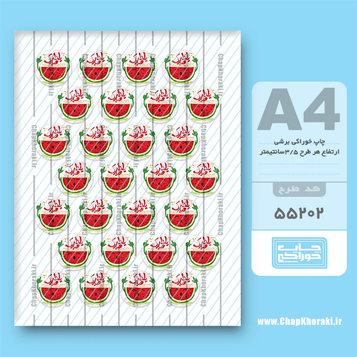 استیکر خوراکی یلدایی، نگاره ای فانتزی از یک قاچ هندوانه دارای دست و صورت در ترکیب با گزاره ی “یلدا مبارک” درون دایره هایی به قطر 3/5 سانت و تعداد 28 مورد در یک صفحه خوراکی A4 مناسب استفاده برای سطح کاپ کیک، کوکی، آبنبات، مرنگ، ماکارون و شکلات