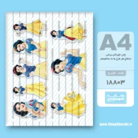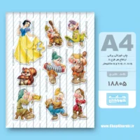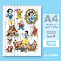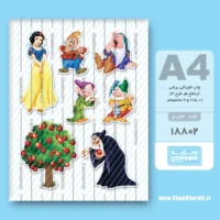 طرح چاپ خوراکی کارتونی سفیدبرفی و هفت کوتوله، مجموعه ای از شخصیت های انیمیشن Snow White and the Seven Dwarfs از جمله نیم تنه سفید برفی با چهره سه رخ به همراه شاخه گل در دست، ملکه بدجنس با سبد چوبی و سیب قرمز، کلبه قارچی، نیم تنه سفید برفی همراه گل در دست درون قاب پتینه، پرنده های زرد و آبی در جهت مخالف هم، سیب قرمز به تعداد چهار عدد در طرحها و ارتفاع های متفاوت از سه سانت تا سیزده سانت به تعداد 11 آیتم در یک صفحه A4 خوراکی مناسب استفاده بر روی دیواره، سطح کیک و به عنوان تاپر روی کیک، کوکی و کاپ کیک