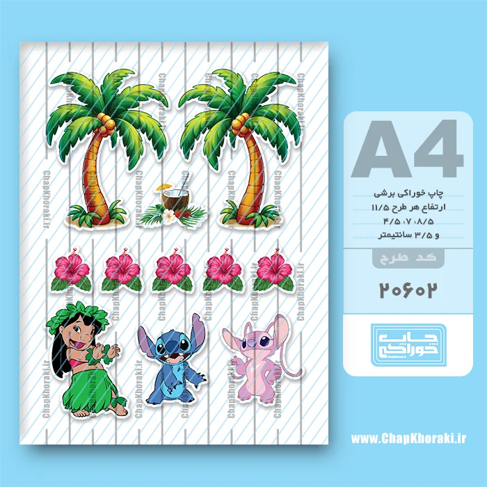 طرح چاپ خوراکی کارتونی لیلو و استیچ مجموعه ای از تصاویر انیمیشن ( Lilo & Stitch ) ، شامل عکس خوراکی لیلو و استیچ با فیگور های متفاوت، درخت نخل به تعداد دو عدد با جهت های مخالف هم، نارگیل و گل به تعداد پنج عدد در طرح ها و ارتفاع های متفاوت از سه و نیم سانت تا یازده و نیم سانت به تعداد 11 آیتم در یک صفحه A4 خوراکی مناسب استفاده بر روی دیواره، سطح کیک و به عنوان تاپر روی کیک، کاپ کیک و کوکی