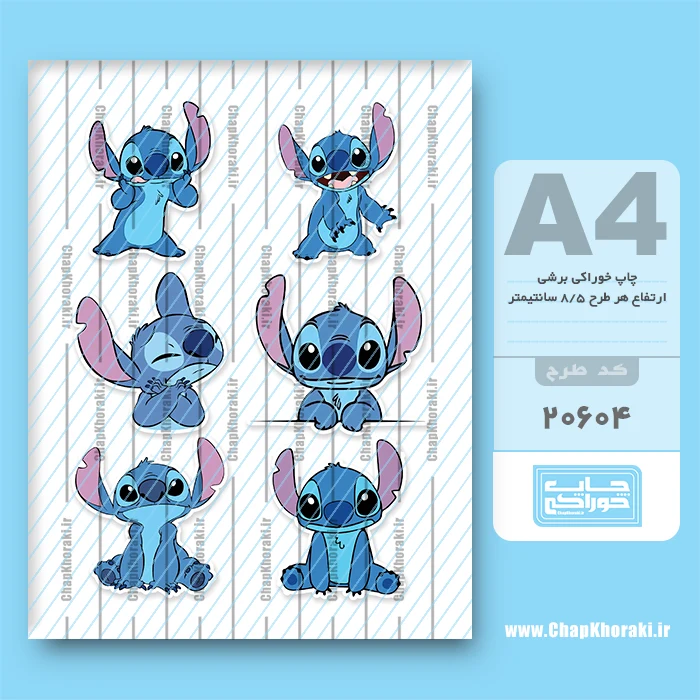 طرح چاپ خوراکی کارتونی لیلو و استیچ مجموعه ای از تصاویر انیمیشن ( Lilo & Stitch ) ، شامل تصاویر خوراکی استیچ ( Stitch ) ، در طرح های متفاوت و ارتفاع های هشت و نیم سانت به تعداد 6 آیتم در یک صفحه A4 خوراکی مناسب استفاده بر روی دیواره، سطح کیک و به عنوان تاپر روی کیک، کاپ کیک و کوکی