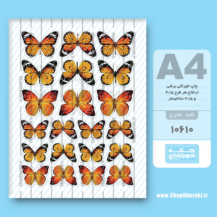 چاپ خوراکی طرح پروانه، نگاره ای از یک پروانه ی ظریف با بال های بنفشِ طیف گون با حاشیه ی هم رنگ در انتهای بال و دارای شاخک با ارتفاع 4 سانت به تعداد 18 قلم در یک صفحه خوراکی A4 مناسب استفاده برای دیواره، سطح و تاپر کیک، کاپ کیک، کوکی و آبنبات